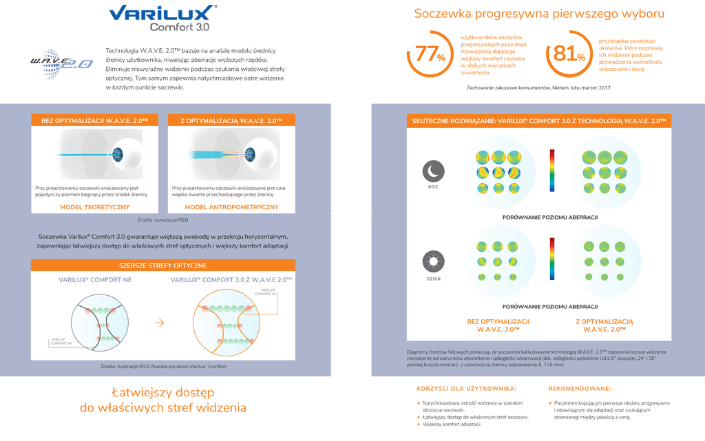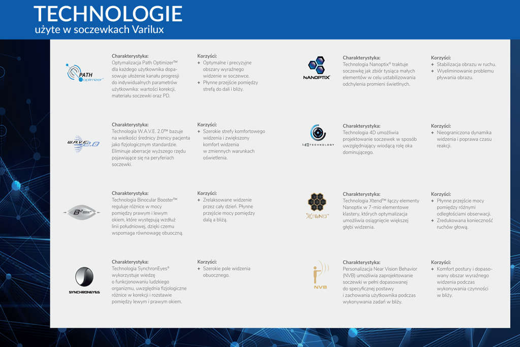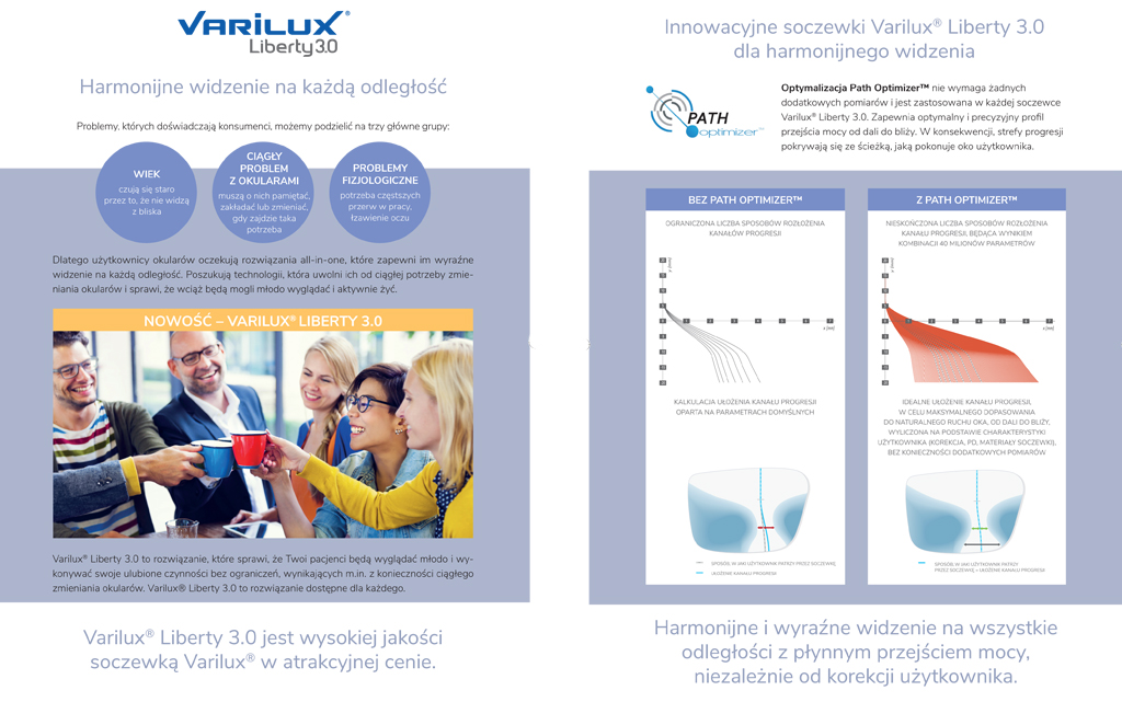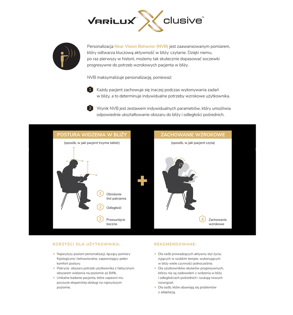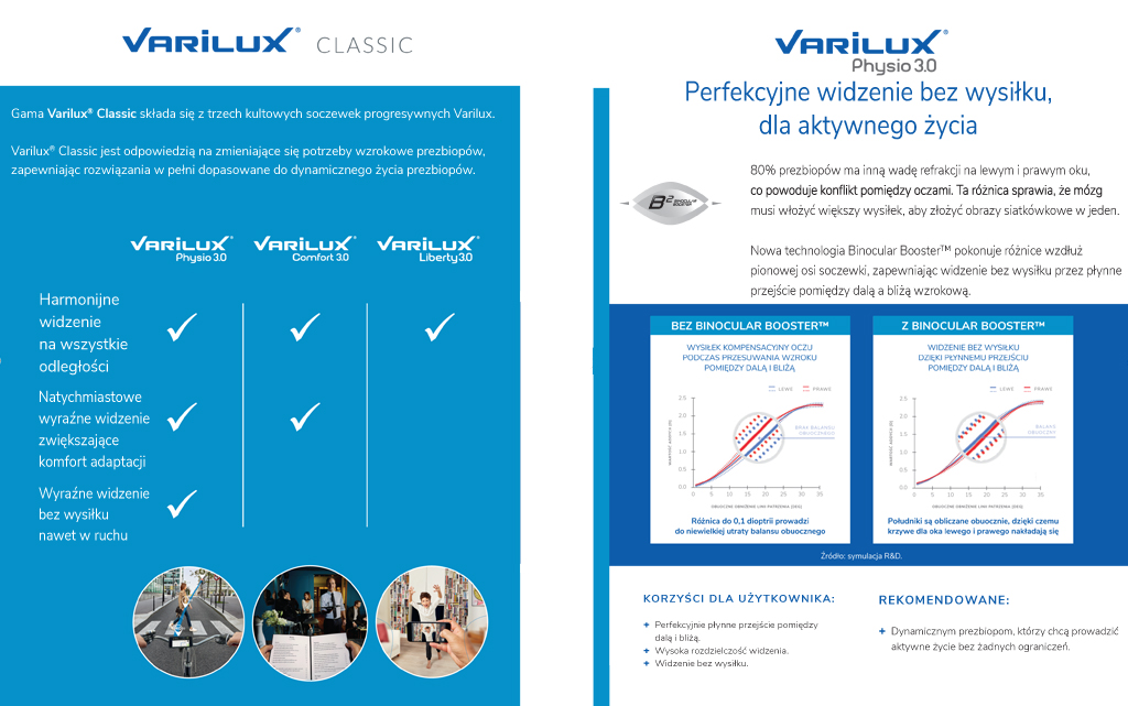 Pierwszym na świecie producentem soczewek progresywnych był Essilor i nadal soczewki Varilux są jednymi z najlepszych na rynku optycznym. Tylko Essilor dostosował konstrukcję soczewki progresywnej do aktualnego stylu życia – osób pracujących przy komputerze. Soczewka Varilux X-Design oraz Varilux Xclusive zapewnia komfortowe, nawet wielogodzinne widzenie na odległości pośrednie i bliskie (m. in. praca biurowa). Jest to obecnie najbardziej zaawansowana, najlepsza uniwersalna soczewka progresywna, która do przeprowadzenia pomiarów wymaga specjalistycznego sprzętu. Dla maksymalnej jakości widzenia mierzymy specyficzne parametry, np. położenie środka obrotu gałki ocznej. Z kolei tradycyjna soczewka Varilux Comfort 3.0 świetnie sprawdza się u osób, które dużo czytają. W każdej soczewce progresywnej Varilux możemy zastosować dodatkowe, indywidualne parametry, dzięki czemu widzenie w okularach progresywnych będzie jeszcze bardziej precyzyjne.