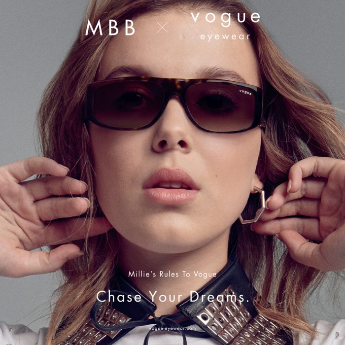 Najnowszą twarzą marki Vogue jest Millie Bobby Brown, brytyjska aktorka i modelka. Millie Bobby Brown znana jest głównie z produkcji serialowych takich, jak „Stranger Things”, „Chirurdzy”, czy „Agenci NCIS”. Jej kariera natomiast rozpoczęła się w roku 2013 rolą Alicji w serialu „Once Upon a Time in Wonderland”. W kampanii reklamującej najnowszą linię okularów Vogue, aktorka zachęca wszystkie kobiety do ogromnej wiary w siebie, a także do prezentowania światu kim są one naprawdę. Główna zasada Millie Bobby Brown to Love yourself – kochaj siebie. Poza tym, że Millie jest twarzą marki Vogue, jest ona również autorką specjalnej kolekcji zaproponowanej przez tę firmę. Znajdziemy w niej niezwykle modne okulary korekcyjne i przeciwsłoneczne, skierowane do nowoczesnych kobiet o wyrazistym stylu oraz zróżnicowanych osobowościach. Kolekcja Millie Bobby Brown to z pewnością ogromna mieszanka nastrojów, odzwierciedlona w kształtach, kolorach i fasonach okularów.
