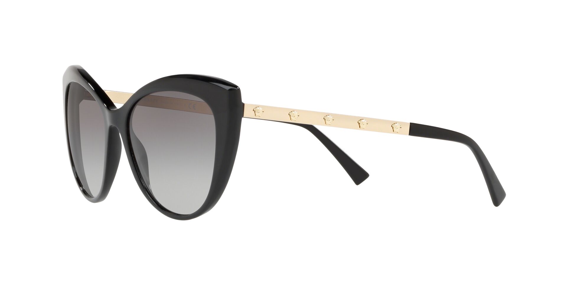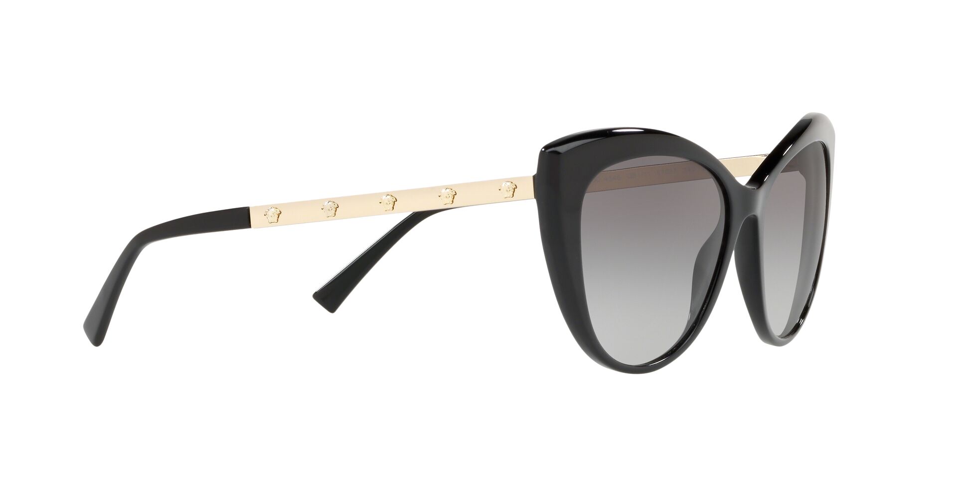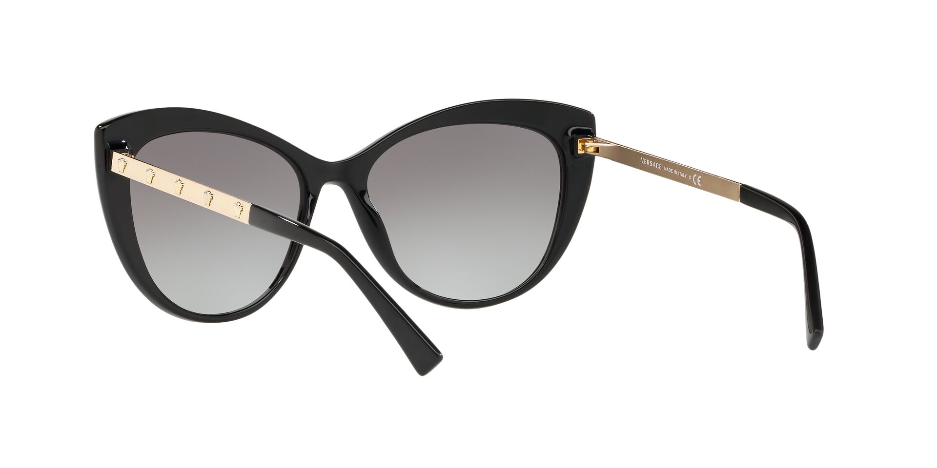 Okulary przeciwsłoneczne Versace VE4348 GB1/11 należą do bestsellerów marki luksusowej Versace. Delikatne i kobiece, choć jednocześnie wyraziste i z charakterem idealnie odzwierciedlają ducha marki. Czerń i złoto grają główne role w tym “kocim” modelu idealnym dla osób szukających czegoś “z pazurem”. Dodatkowo na metalowych zausznikach znajdziemy aż 10 twarzy Meduzy – symbolu nierozłącznego z marką Versace.